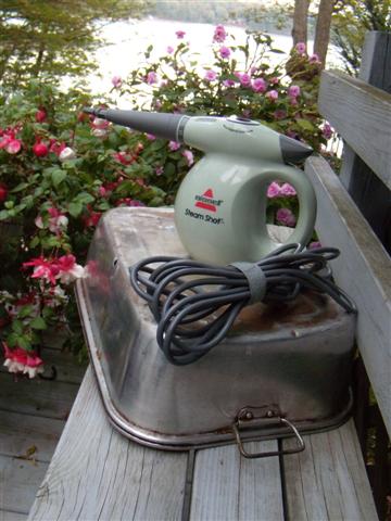 Hand steamer: $30. Pan (at local Goodwill) $1