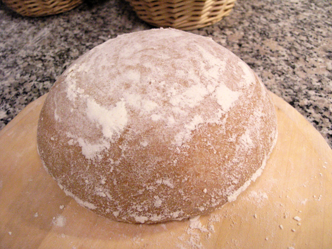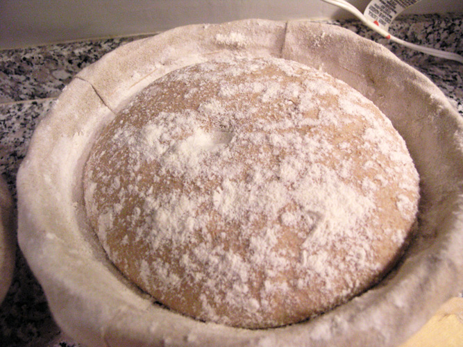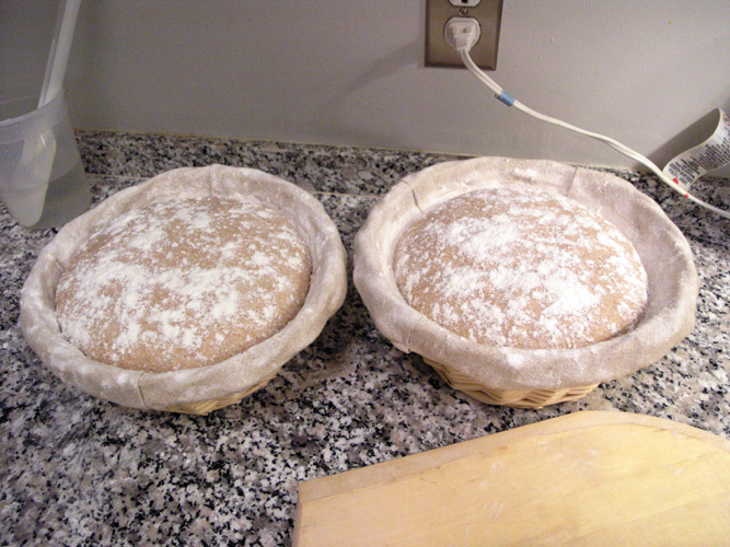 12:10am - Tighten boule, flour top, place in well floured linen lined banneton/basket, place in plastic bag and let proof.  Place 2 baking stones into oven along with steam pan in oven.  Go to bed.
