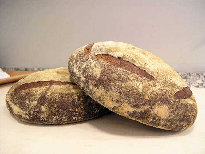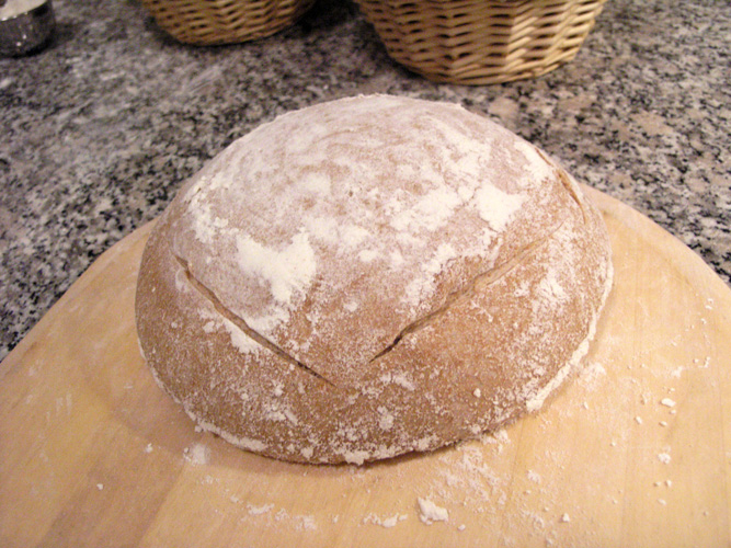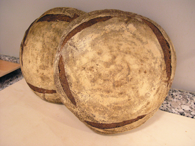 6:00am - Wake up, turn convection off, turn boules onto a lightly floured peel, place in oven directly on the baking stone.  When the last loaf is in, pour 1 cup water into steam pan, close door.  Turn oven down to 450F no convection.  Bake 50 minutes, taking the steam pan out at 20 minutes, and rotating the loaves between the stones at 25 minutes.  After 50 minutes, take a loaf out and check the weight and internal temp.  Should be 210F and weight 15% less than the prebaked weight.  Turn oven off and place loaves back into oven for 10 minutes.
