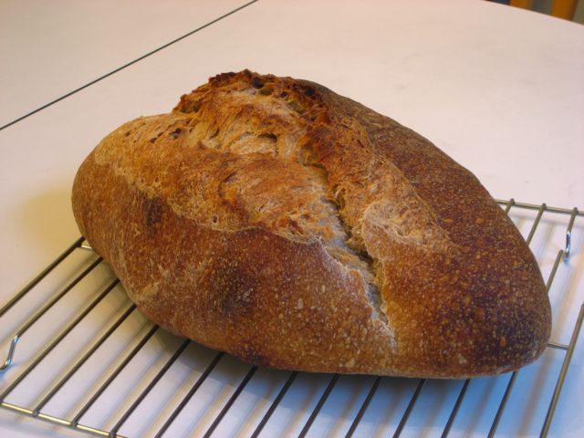 This is a two levain naturally leavened bread, based on Joe Ortiz' recipe from The Village Baker but modified so that, well, to be blunt, it works which the original doesn't really. The only substantive change is at the beginning, rather than starting a chef from scratch and expecting to get a sufficiently active culture to raise a loaf, I start with a liquid-ish starter.
