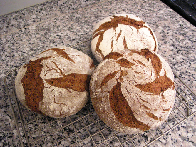 Just wanted to share with you this bake from 9/23/10.  It is a Tourte Auvergnate inspired by the recipe in Le pain, l'envers du décor by Frédéric Lalos.  His version is basically 80% rye, and the rest in white flour, which is made into a stiff levain.  I decided to make mine with 75% rye flour, and 25% AP flour.  I made the AP flour into a stiff levain, and then with some of the rye flour, I made a rye sour.  Here's the formula, process, and pictures.  Enjoy!