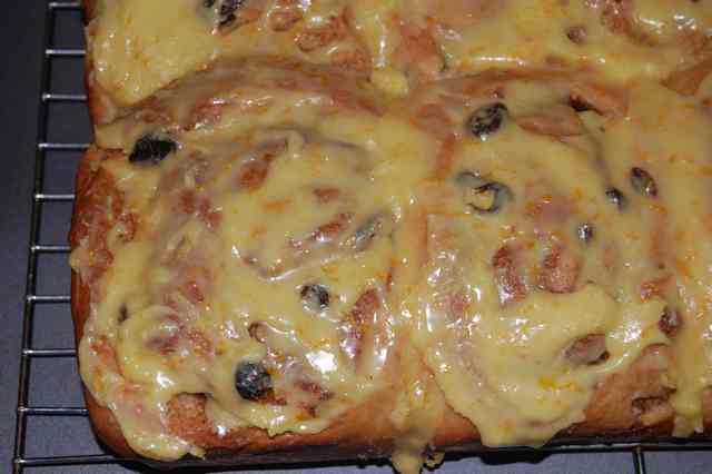 I eliminated the nuts (allergies) and used granulated white sugar rather than brown sugar (pantry deficiency). I made an orange glaze using the zest of one orange, juice of 1/2 orange and 1 2/3 cups powdered sugar. Waiting for them to cool before I can report on the taste but they smell devine.