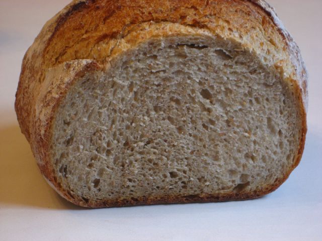 The flavor is wonderful. The crumb is a sort of alarming grey, but that's just the oatmeal. You can't feel the 7-grain cereal (which is a hearty cracked grain thing) but you can see it in there. I was looking for a more open crumb, but I probably wound up overworking it in my struggles with apparent hydration. As you can see it was a trifle underproofed (frankly, it may still have been cool from the fridge inside) and my scoring.. sucks.