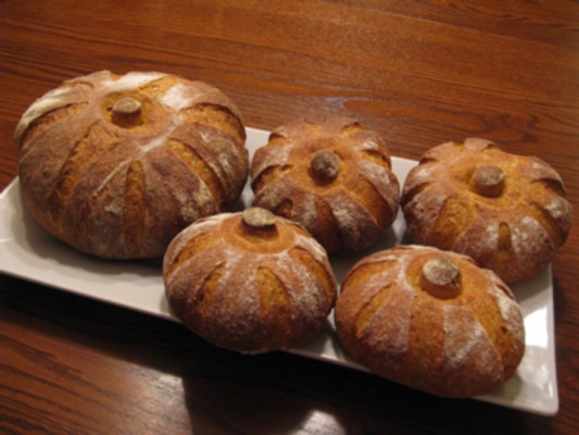 To shape these breads, I shaped boules and slashed starting at the bottom and up to the top, almost to center, trying to make "pumpkin lines". I took a small round cookie cutter, floured it, then twisted and gently pushed down, twisting back and forth, until I'd cleanly cut a "stem".