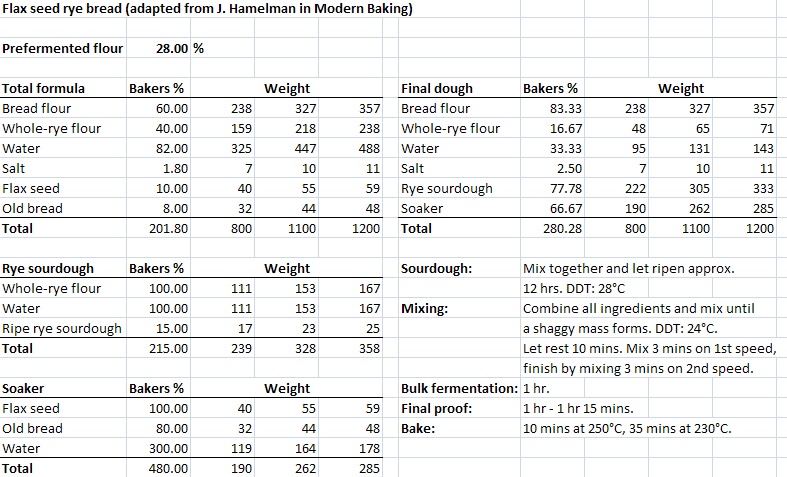 The colder times of the year are also the best to bake in, and this week I've tried my hands at one of my absolute favourite lighter rye breads, Hamelman's flax seed rye from Modern Baking. The formula is very similar to many of his rye sourdough breads from "Bread", but I feel the Modern Baking flax seed rye is even better balanced in terms of overall hydration and amount of soaker. The addition of stale bread to the cold soaker gives this bread a unique, robust rye flavour.