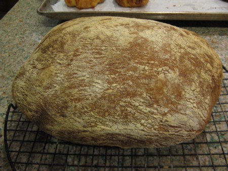The bread puffed up nicely in the oven. I was hoping to find beautiful holes like Steve's when I sliced the loaf, but I still have room for improvement. I love how the bread looks and smells. Tasting will have to wait for another day.