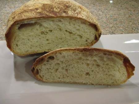 SteveB's instructions are to divide the dough but I baked it as one big ciabatta.