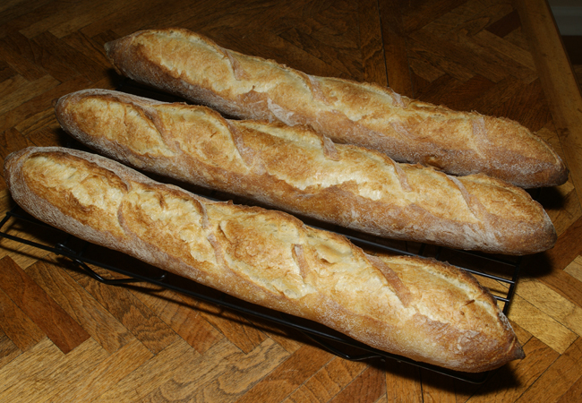 Yesterday afternoon, after a two month hiatus, I celebrated my new-gotten mobility by mixing dough for my Overnight Baguettes formula; shaped and baked them this morning.