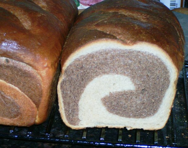 I'm working on a two-tone wheat loaf using Reinhart's Whole Grain Breads "100% Whole Wheat Sandwich Bread". This was 2 recipes using King Arthur's whole wheat flour (and some cocoa powder for color) and white whole wheat flour. I divided each dough into 2 pieces and layered the white whole wheat and whole wheat doughs after rolling them out. It's still a work in progress.