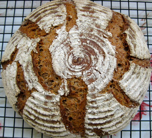 Shape dough into boule, and proof in banneton, seam side up (or down, depending on the pattern you want - the bread on the photo was proofed seam side down, no scoring necessary), at room temperature for ca. 2 - 3 1/2 hrs., or until bread has risen to about 1 1/2 times its original size. (Preheat oven after ca. 2 1/2 hrs.)