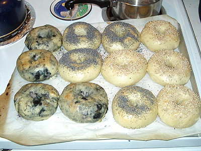 I made another batch of bagels last night. My son dug the blueberry bagel we got from Safeway last week, so I decided to make a third of the batch with blueberries (bagel snobs: insert derisive comments here).