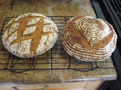 ... and loaded them into the oven. They baked at 500F for about 5 minutes (steam with water squirted on the inside wall of the oven), then 30 minutes at 400F. Here's what they looked like right out of the oven....