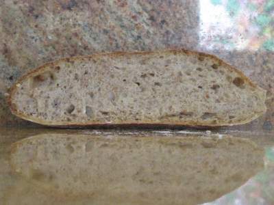 Although not as airy as some sourdoughs I see, I'm very happy with the crumb. The sourness is about mid-range: not the sourest I've tasted, but not subtle. I think I'll be using this to accompany strongish lunch meats or cheese.