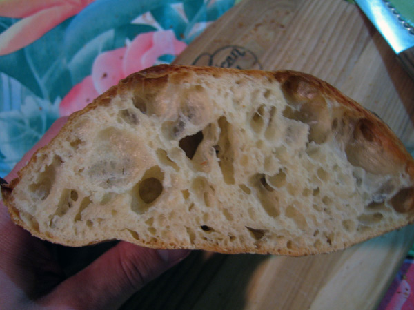 I had a batch of my pooish bread in the fridge as well as some sourdough with 20% whole wheat. Since the poolish bread was on the damp side, I ended up dimpling it and shooting for something like a ciabatta. Inside, it looked about right.