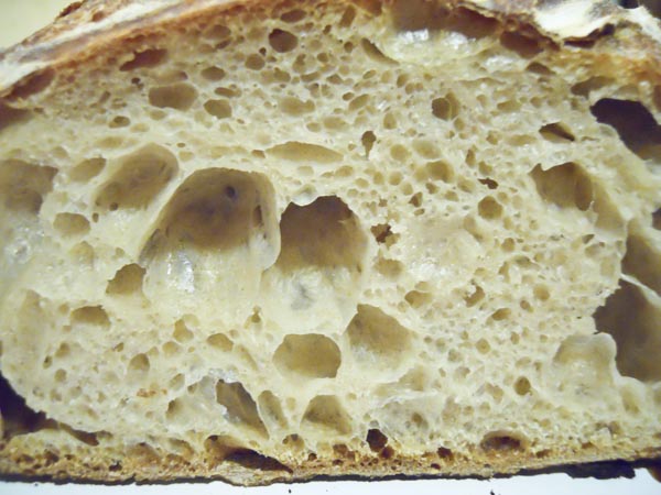 The crust was very crisp and the crumb was just beautiful. Creamy moist with a spongy kind of a chew.  A pure delight. (Quick hand me that bottle of truffle oil) And no hint whatever of sour. This surprised me because my starter is assertively sour and past attempts at other conversions still bake off as a sourdough; sometimes mildly so but always with some sour note. This bread has none.