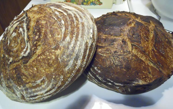 Converting my starter worked just fine. Instead of Fri I started it Sat a.m. so it got 3 healthy conversion feedings before I built the levain Sun p.m. This was the first time I have done everything by hand;  kind of a primal rush, with a little eeeww factor :) This is an intensive bread on the attention level.  When the loaves reached the final shaping and into the bannetons I put 1 in the fridg for an hour  so it would be ready to pot right after the first one finished. I had a gigantic mishap with the first loaf. I tried to plop it into the hot Dutch oven from the banneton but it stuck a little snagged the side of the pot and kind of summer saulted in on its side. I shoved it into a round as best I could but there was no way this could be scored. To make things worse I couldn’t get to it when the last timer went off and it is much too dark...crust tastes burnt. It’s got some interesting fake ears from sliding down the side of he pot. LOL