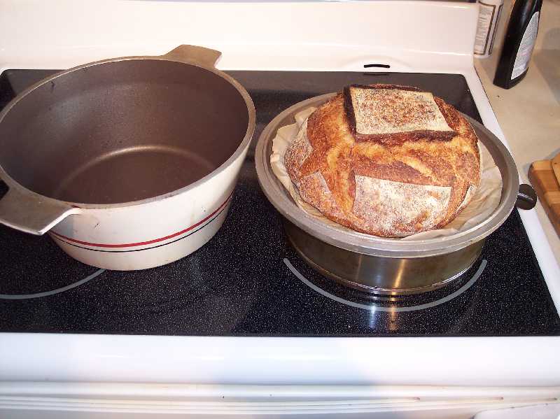 This makes it much easier to get the proofed loaf into the DO, and clear access for scoring. I put the bottom of the DO over top of the loaf and baked it as per the instructions. I had to remove the top rack so there was enough clearance to remove the bottom (now the top) of the DO, but this way makes it much easier to load the dough into the DO. It seemed a better configuration to me for a bread to bake from the widest part of the pot, and give it more room for expansion on the sides. Just a suggestion, but hopefully you'll find it helpful for next time.
