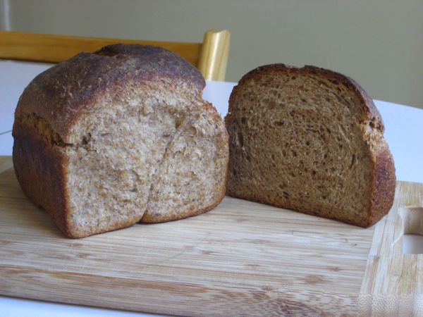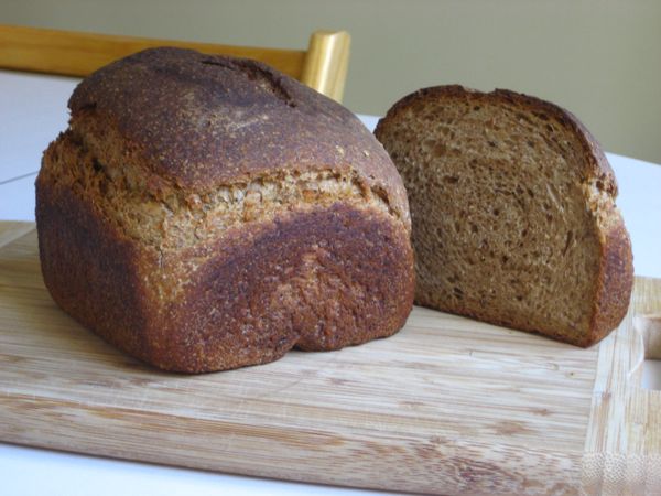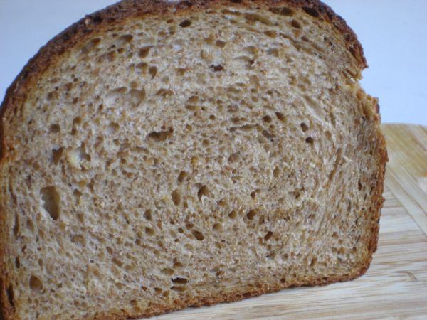 The bread is mild-rye-ish, a little sweet from raisins (depending on how many you used) and a little caraway flavored (again, depending on how much you put in) and has a mild sour tang. The crumb is moist and dense, and has little crunchy bits in it from the hot cereal, which we like for texture.