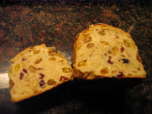 This was from floydm's Pannetone recipe on the homepage picture. It is quite delicious but more fruit bread than bread with fruit. I think next time I will use only about 1 1/2 c fruit total (fruit and raisins together) than 4 cups (as in recipe) as I prefer my holiday bread to be more bready. It may rise faster,also. I had orange flower water and added vanilla for a really wonderfully scented bread. The dried fruit I used were craisins,candied orange peel,candied pineapple and golden raisins. I had slivered almonds instead of sliced. Sliced almonds would have been better. The topping was sugar mixed with a few drops of the orange flower water and vanilla,stirred to a wet,crumbly stage and put on top before baking for a crackly kind of finish.