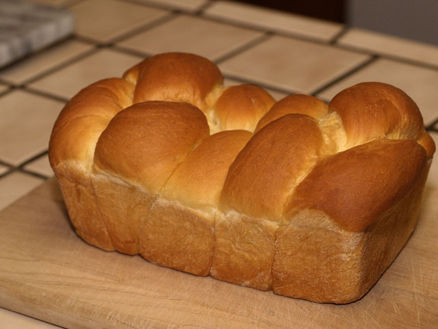 In the original form the recipe below was stated by volume, but I have successfully converted it to weight, and I get much better results than I did when I baked it by volume.  Also, it is a big recipe that makes four 9" x 5" pan loaves if you use the full measure.   The recipe is very reminiscent of Challah and has similar consistency, and while I have never baked this as a stacked-braid loaf I think it would do well that way.