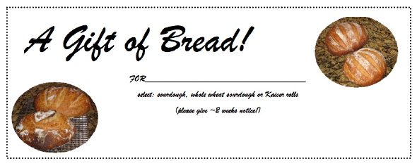 I posted yesterday about making gift certificates for Christmas presents. I was able to find an editable (MS Word) document and I included some loaf shots. I'll be giving these out to a bunch of people. Here is the certificate I made: