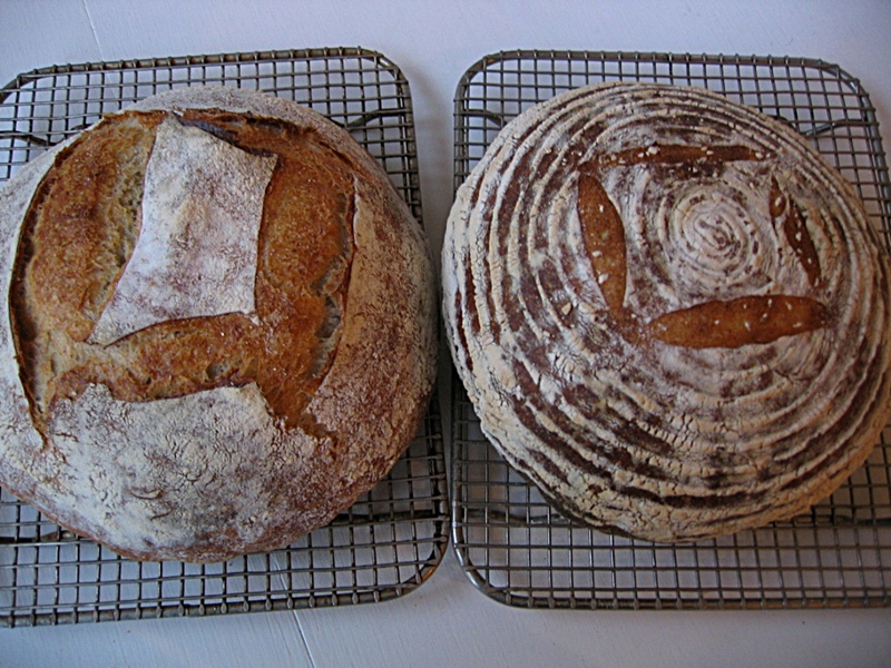 I scaled the recipe to yield two 680 g (about 1.5 lb) loaves. One I allowed to proof in a banneton, the other in my new brotform. This is a nice bread to make when you have a lazy day and don't need to accomplish the baking in a hurry. Between the mixing and autolyse, its long fermentation (two-and-a-half hours) and equally long final proof, the process lasts about 6 hours before baking. But since there's very little you actually need to do over this period (except for the mixing, one fold and then the final shaping), it's one of those breads that takes a long time but leaves you with lots of time to do other things while waiting on it.