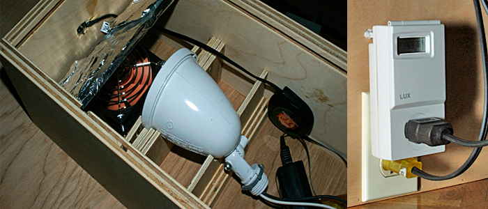 ...was the breakthrough for me. I've used a temperature controller making lager beer in a refrigerator (54°F) for more than a decade, but the controller's price is $70 plus S&H, and its form doesn't lend itself to a small, neat package. I found the thermostat on Amazon for about $40, free shipping, and nicely adaptable for a countertop design. I researched heating pads, and terrarium and reptile cage heaters, but finally settled on the halogen light ($12 at Home Depot). I couldn't think of a way to avoid hot spots without using a fan regardless of what heating method I used.