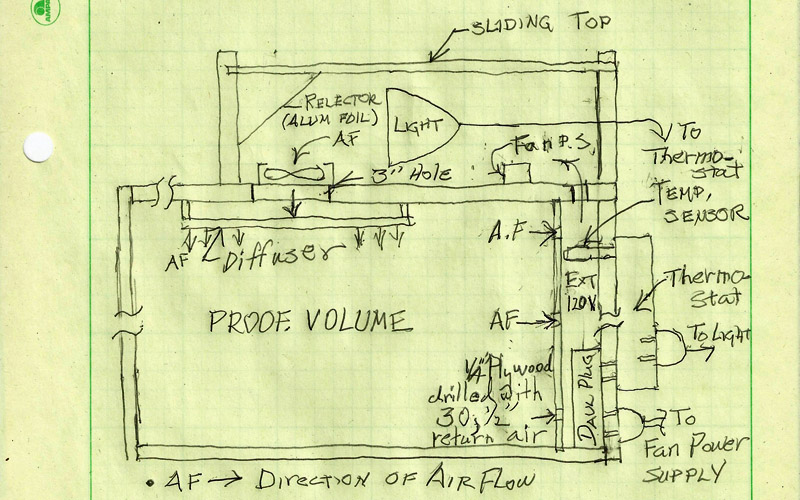The air reenters the smaller box containing the light through a row of 1/2" holes drilled in the proofing volume's top, above the temperature sensor. I noticed that wasn't too clear in the sketch. The fan runs continuously; it's not controlled by the thermostat.