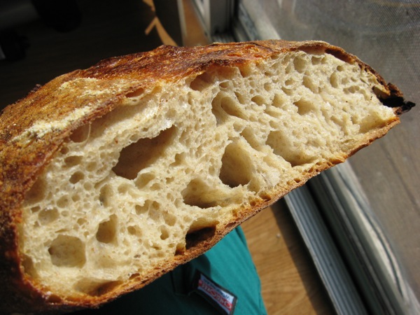 The crust got a little burnt on one side due to uneven oven heat, and I didn't quite get the kind of spring I wanted - the profile was a bit flat. However, I'm pretty happy with the crumb: