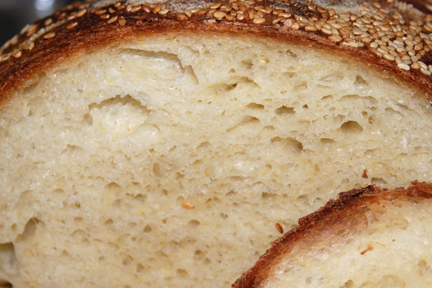 The inclusion of Durum flour adds a very nice nutty note to the aroma. I almost feel as if I am smelling or tasting the sesame seeds on the outside. The Durum lends an unusual flavor. It is most delicious. The crumb is open well enough and the cells are gelatinous. The dough was 7.3 Lbs in total divided into 4 parts, mixed by hand and folded twice during the 2-1/2 hours of fermenting and proofed in round linen lined baskets. I pinched the dough while in the baskets across the sides to make them oval just before turning on to the flipper board. I spritzed the dough and sprinkled the seeds over all before slashing.