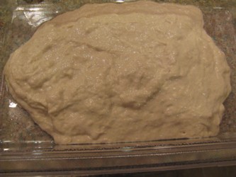 When mixture is at 70F, mix in Starter. Ferment at 65-70F for 12 hours. (My Teff levain was starting to recede after 7.5 hours; I carried on with the mix at that point). |