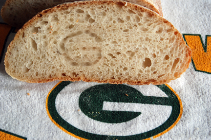 For the game yesterday, I baked this rustic loaf to munch on during the game with spreads and cold cuts. The football shape was in the spirit of the Super Bowl game in which our home team, the now WORLD CHAMPION Green Bay Packers, was a participant and victor. Imagine my surprise when I cut into the loaf to see this crumb pattern? The karma is thick around these parts when the Packers are playing.