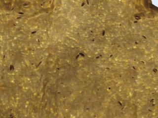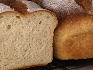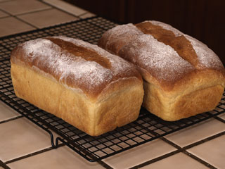 Also out on loan from the bookmobile, I have George Greenstein's "Secrets of a Jewish Baker", where I found a formula for Potato Bread. I have always liked potato bread, and my wife prefers bread with "substance", so I baked the 3-loaf build of this formula on Sunday evening. The book notes that potato bread dough is always "a little sticky". I only quibble with the "a little" portion of that statmement. The dough was quite sticky, and took generous dustings of flour on the board to get it into shape. I should have added a tiny bit more flour as the dough was very loose in addition to the sticking, even after fermentation. I also adjusted from the active dry yeast in the formula to instant yeast, and then went still shorter yet since my instant yeast breads seem to explode on me. It must be my water or something because I need to reduce the yeast even more next time. This dough was a rocket-riser, and was ready quite early. The results, however, are quit acceptable, in both flavor and appearance.