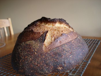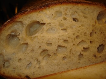 The look of the crust isn't that appetizing, and that's why I tried to bake it in the dutch oven. However, I'm not quite satisified with the outcome of the dutch-oven-crust. Another member of this forum, Txfarmer, has recently blogged about her bake of this miche, and her miche has the most amazing crust colour and texture (based on her descriptions of the loaf). I guess I'll have to keep trying :)