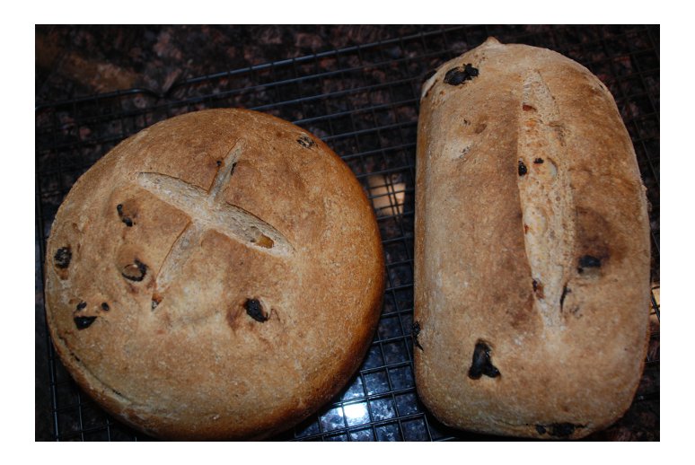 Well if we are on the threshhold of a new ice age I suppose I better get some snow tires. Actually I'm not sure myself what a pointy-headed bread would be now that I think of it. But this raisin bread is a classic Hamelman sourdough with yeast and oats and raisins thrown in (no walnuts) and that gives it a completely different character. -Varda