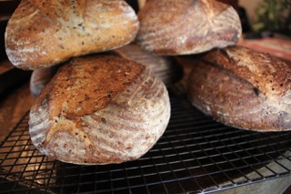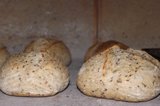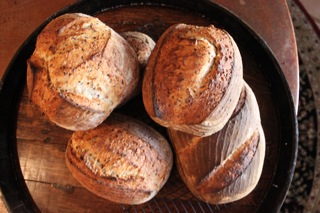 The bread made was adapted from Hamelman's Multigrain Sourdough, using sesame, flax, and sunflower seeds.  I've made this bread a couple of times and baked in my kitchen oven using a pan filled with lava rocks to create.  In this case, I doubled the home recipe, and baked outdoors, using a hot wet towel in a roasting pan, with hot water poured in the pan to create steam.  Met an artisan baker at the huge bread conference last fall in Las Vegas who recommended this technique.