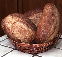 This formula produces four loaves of bread.  I could not find a pleasing way to fit all four into my basket, so here are three of the four.