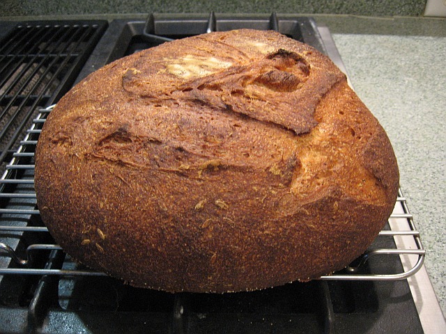 I followed dm's recommendation for the bake: 15 minutes at 525 deg.F; 45 minutes at 420 deg.F with convection. Here's the baked loaf: