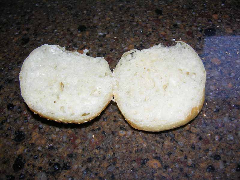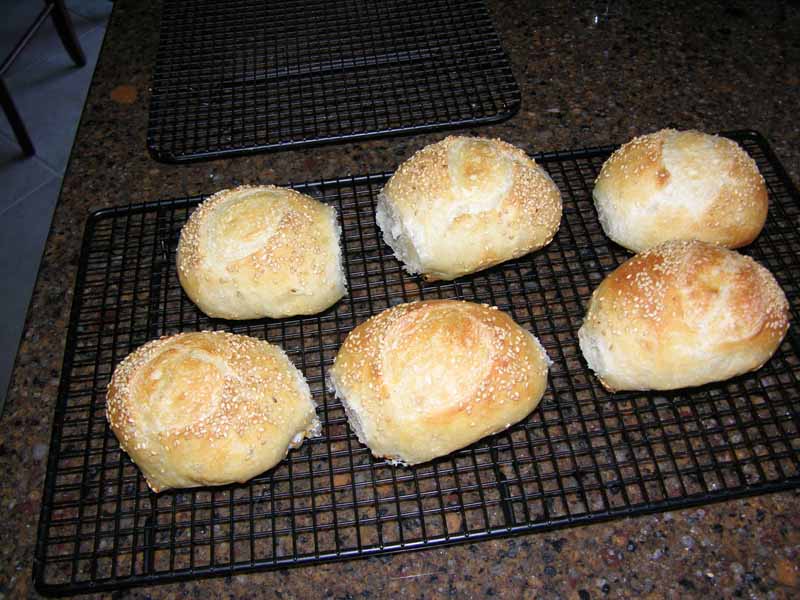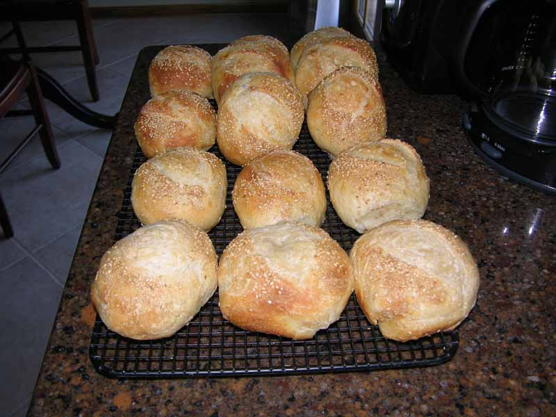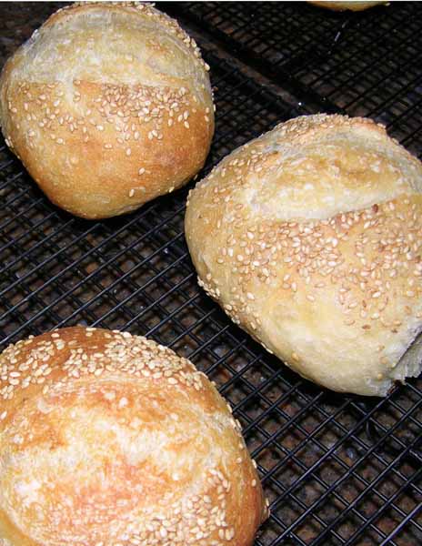 Today's experiment. I got tired of chasing hard rolls for my husband's lunches and these worked out well. I rolled 4 oz of dough and put three in each oval brotform to rise. Then baked them in oval clay bakers for 30 mins and an additional 5 mins uncovered to darken. Egg white/water wash with sesame. Here's the recipe: