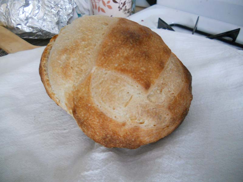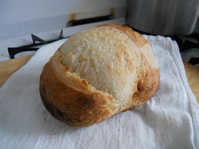 Problem 3 - After baking and cooling I cut it open to see the crumb. It wasn't bad and the flavor actually really good, especially compaired to my first attemp which was quite tangy. This was a nice rounded sourdough flavor, not too punchy in any direction. Regardless, the crumb was slightly dense. I'm assuming I didn't get a full rise combined with not cooking it properly?