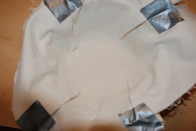Hi, This isn't a very elegant way of doing it, but it works pretty well for a quick and dirty approach.  Place the piece of linen on top of the rim, then press it in so it conforms but concentrate the wrinkling into four folds.   At this point you could sew along the creases to hold in place.   I just duct taped it.   Not very pretty but it does the trick.   The folds do crease the dough a bit, but not much.   You could cut off the extra cloth in the fold and then sew along the cuts I suppose.