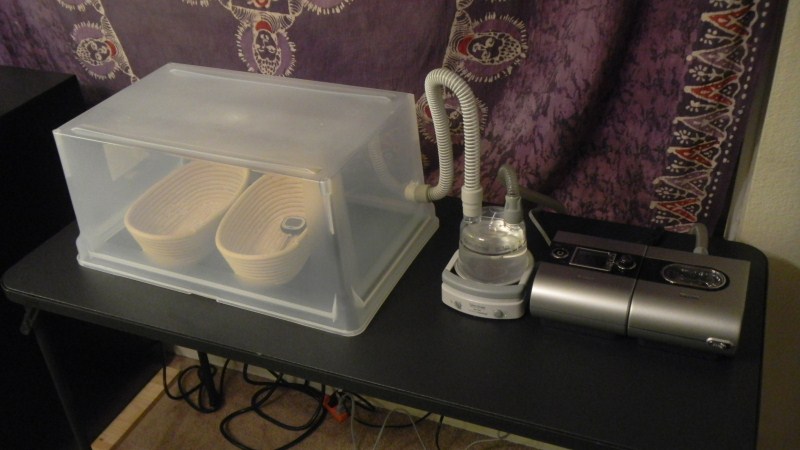 Here is my homemade proofer box.  A simple plastic box, fed by a soft flow of warmed humid air from a spare CPAP machine and humidifier I had in the closet.   It works!