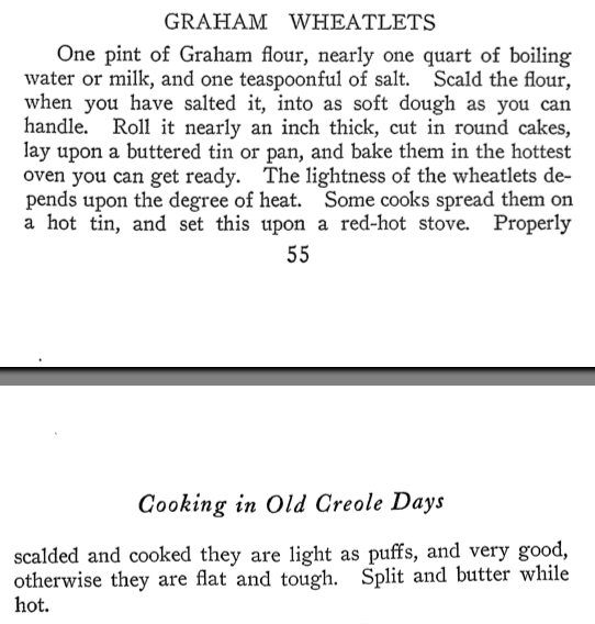 I was at Feeding America looking in the 1904 Creole cookbook and found the Graham recipe on page 55. It makes a dough using a water roux method and then cut out shapes for a very hot oven. I think the description of "one inch thick" sounds more like a scone. I would scale it down to try. I would also try with milk first. I know it's not a pie, but it might be an interesting method for making a roll out crust. This is listed in the English section, there is a French section too.