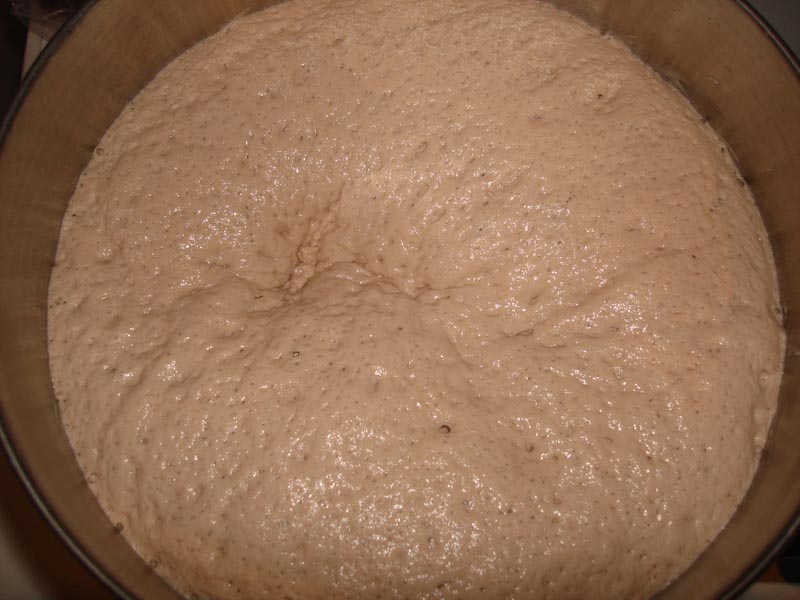 Step 2: Allow the dough to proof until almost overflowing the bowl, at least triple, then degass the dough by either gently stirring or cutting the dough.