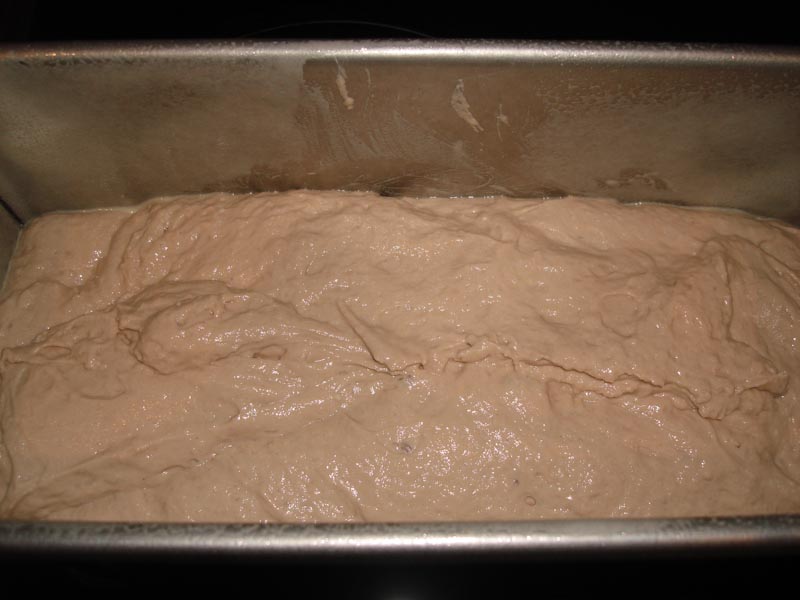 Step 3: Now, after some experimentation, I have found that cooking a ciabatta in an oiled bread tin adds a particular style of finish thats quite appealing, so in this case, pour the degassed dough into a well oiled loaf pan and allow to relax for 5 minutes.