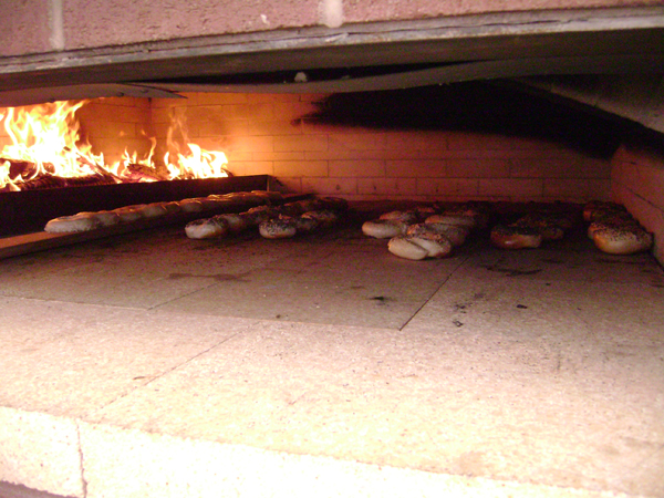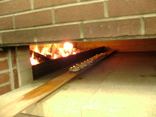 Back to the café to get things started. The oven had been lit the night before and was chugging along at about 570 in the rear corner closest to the heat, tapering off to 450 at the far end of the hearth. The hearth itself was lovely: tightly jointed blocks of cordierite 2" thick by 18" square. Whoever built that oven knew what he was doing.