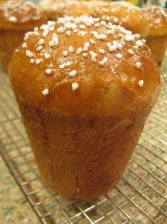 19. Remove from oven, remove breads from pans, and while hot, brush tops with simple syrup; sprinkle on coarse sugar if desired, for decoration. Let cool. |