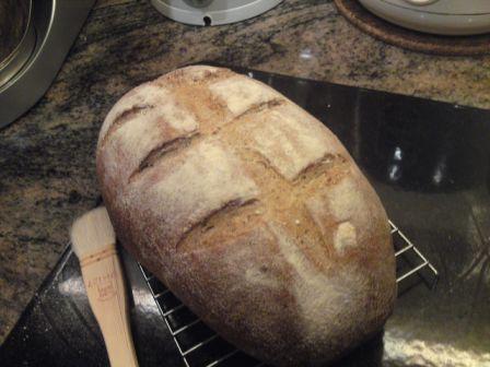 the dough was still soft and wobbly after the first proof .(very much like the dough that Ciril Hitz worked with in his baguette shaping demo). I should have shaped it differently instead of forming it into a boule that wouldn't hold its shape. I had difficulty lifting it off my wooden board and getting it into the bannetton and when I scored it, the dough almost collapsed. Would have been better if I had simply divided the dough into two and just leave it to proof on the baking sheet a second time and bake it as a ciabatta. The next time I run into the same problem, I'll know what to do. - Judy