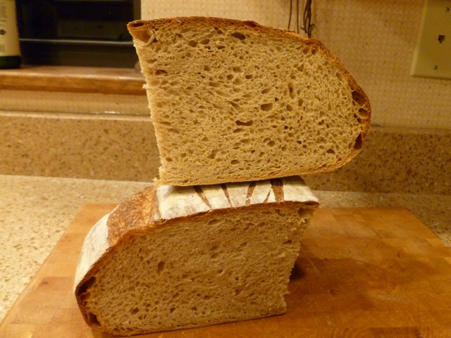 5 S&Fs over about 40 minutes, then fermented 24 hours (noon to noon) in the fridge, with one s&f just before I went to bed, so it didn't get over-fermented overnight. Shaped while still cold and raised in a large bowl lined with my couche cloth, and retarded in the fridge another 8 hours, then at room temp for 1 1/2 hours. Scored in a pattern inspired by Breadsong's beautiful scoring here. Baked on pizza stones with ovren preheated to 500, then after loading and steaming temp was reduced to 425 for 25 minutes, then 400 for another 25 minutes.