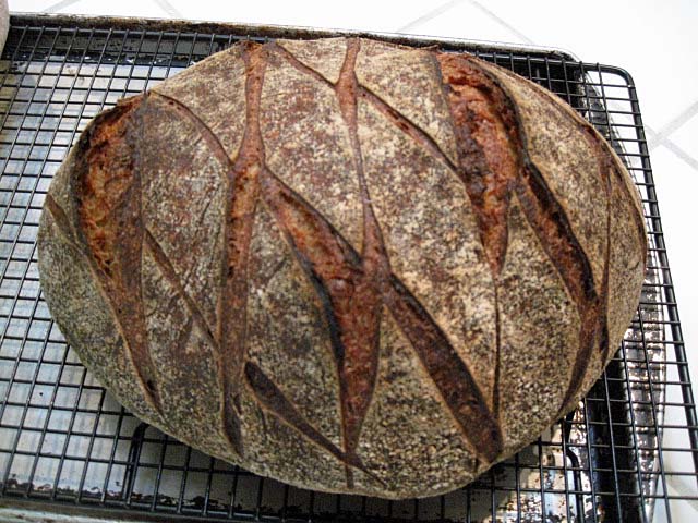 I amended the formula and methods as follows: For this bake, I used my usual sourdough feeding mix of 70% AP, 20% WW and 10% dark rye for the levain. The Final Dough was mixed with about 1/3 Central Milling "Organic Type-85 malted" flour and 2/3 WFM Organic AP, which is also a Central Milling flour. The SFBI method does not include an autolyse, but I did one. (Mixed the water, liquid levain, toasted wheat germ and flour and autolysed for an hour. Then mixed in the salt and proceeded.)